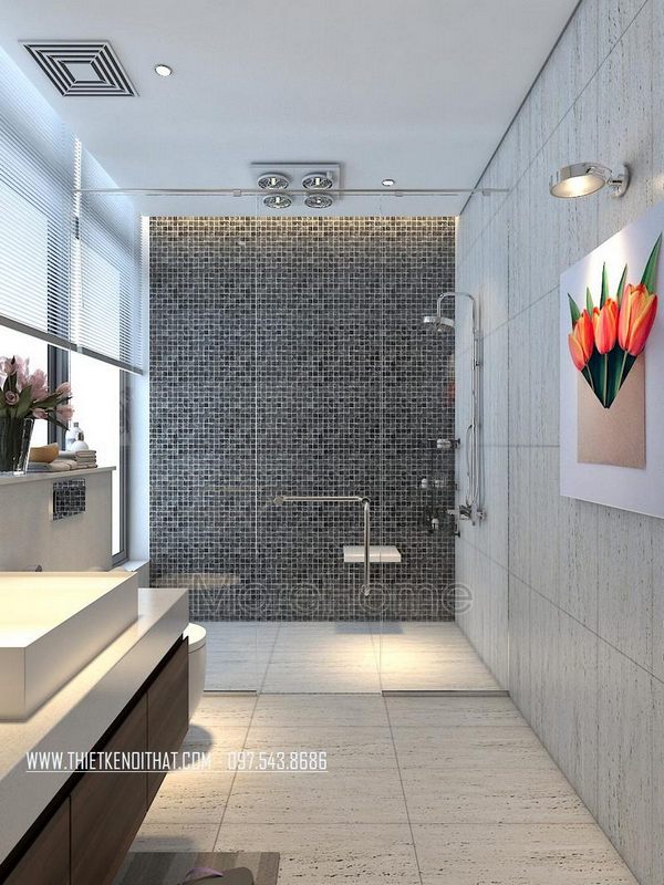Vách tắm kính 180 độ giúp không gian trở nên hiện đại sang trọng, ngăn nước văng sang khu vực khác trong phòng gây ướt át khó chịu.