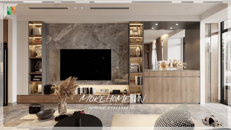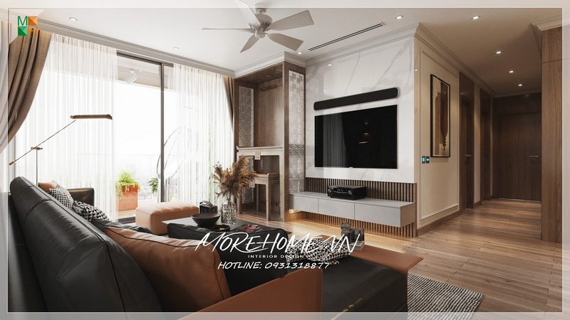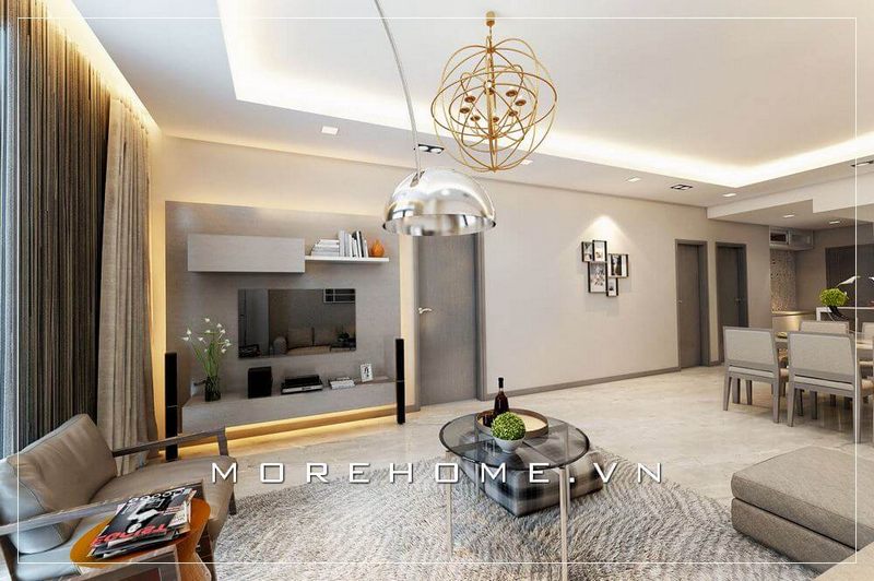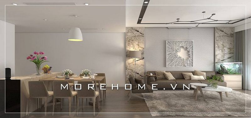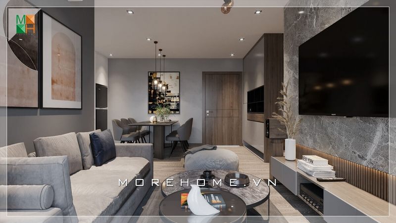 Phòng khách với phong cách căn hộ hiện đại là 1 xu hướng được nhiều người hướng tới. Được thi công hoàn thiện từ bản vẽ thiết kế của các kiến trúc sư Morehome với sự sắp đặt này không gian phòng khách vừa đầy đủ để đảm bảo việc tiếp khách nhưng cũng mang tính thẩm mĩ cao.
