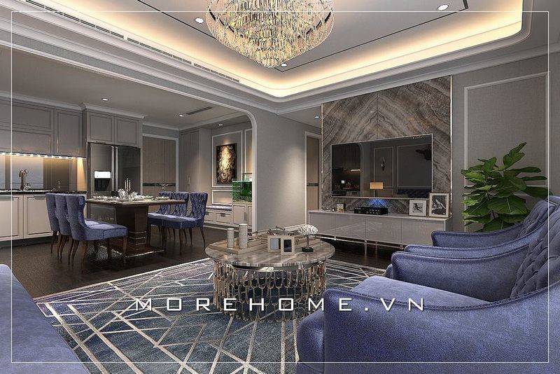 Mẫu thiết kế phòng khách liền kề bếp tân cổ điển và được ngăn cách bởi bộ bàn ăn đang được nhiều gia chủ ưa chuộng và sử dụng cho không gian sinh hoạt chung tiện nghi hơn.