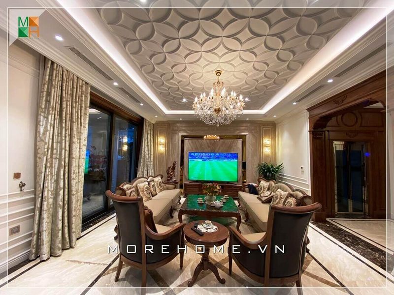 Trang trí nội thất phòng khách biệt thự tân cổ điển nhẹ nhàng, không quá cầu kì vào từng chi tiết nhỏ, tạo nên không gian sang chảnh và thoáng đãng hơn