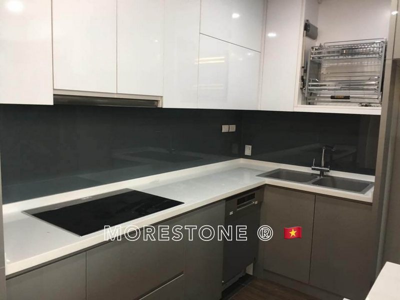 Đá nhân tạo Casla cung cấp cho không gian phòng bếp nhà bạn nét tinh tế và thanh lịch bằng những đường vân xám nổi bật trên ốp bếp.