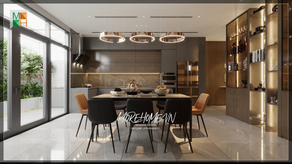 Phòng ăn được thiết kế mở với nội thất gỗ óc chó sang trọng cao cấp, tạo nên một phong cách tân cổ điển cho các biệt thự và nhà phố.